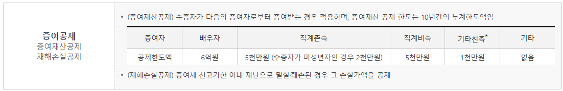 증여세 면제 한도액으로는 배우자 6억 원까지 면제 , 직계비속(자녀 등) 5천만 원까지 면제, 기타 친족은 1천만 원까지 증여세 면제 한도액입니다.