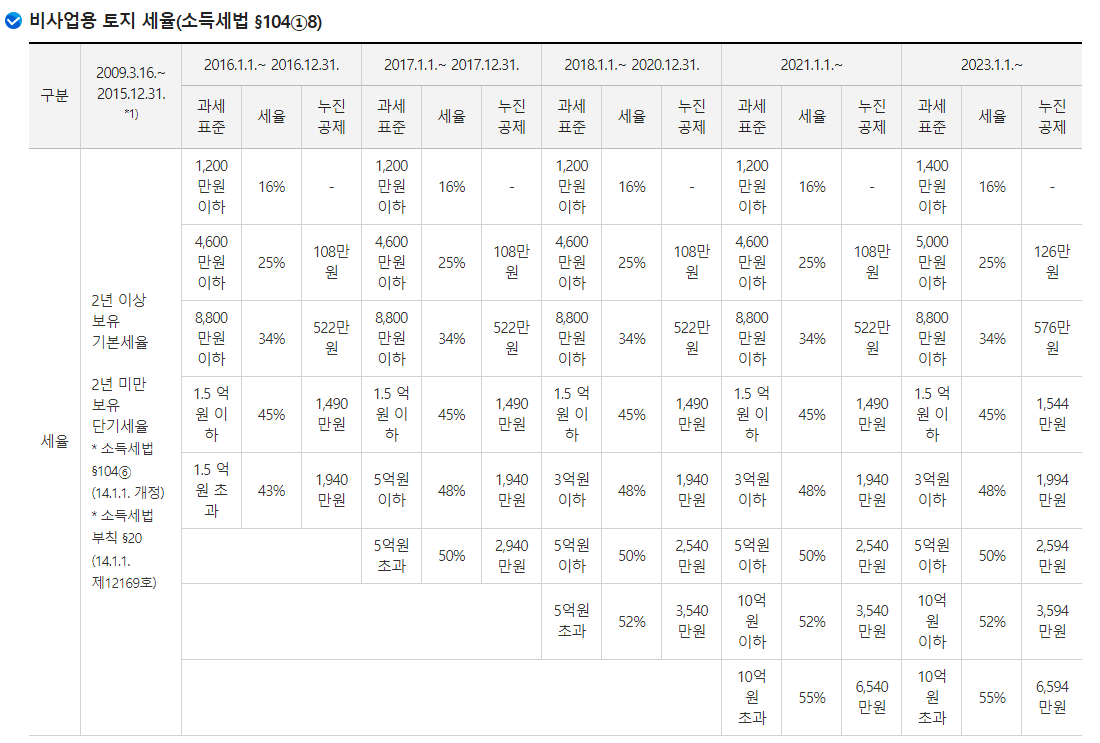 토지 양도소득세는 보유기간, 사용용도에 따라 양도소득세율 차이가 큽니다. 사업용 토지, 비사업용 토지 구분에 따라서 양도소득세가 차이가 많습니다.