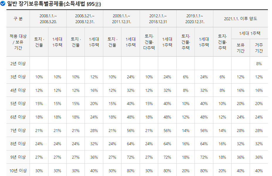 여기에 보유기간에 따라 장기보유특별공제를 적용하는데 최대 30%까지 공제가 되며, 기본공제 1년에 1회 250만 원 공제를 빼주면 과세표준이 됩니다.